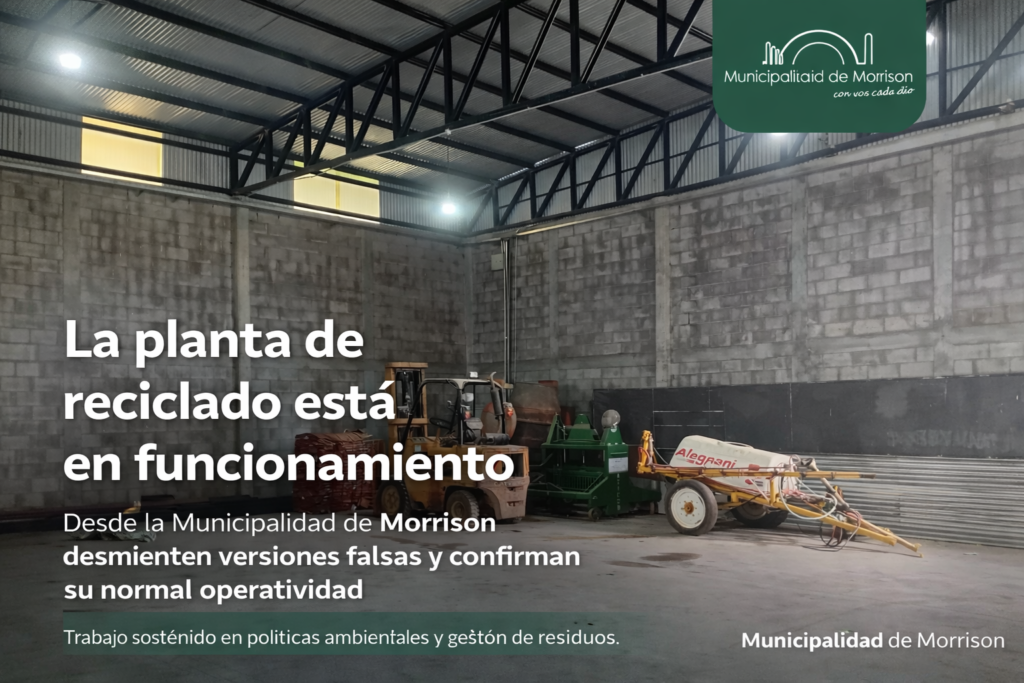 Ante la circulación de videos en redes sociales que señalan que la planta de reciclado de nuestra localidad se encuentra abandonada, desde la Municipalidad de Morrison consideramos necesario llevar tranquilidad a la comunidad y desmentir categóricamente dicha información. La planta de reciclado se encuentra operativa y funcionando con normalidad, bajo criterios de orden, higiene y…